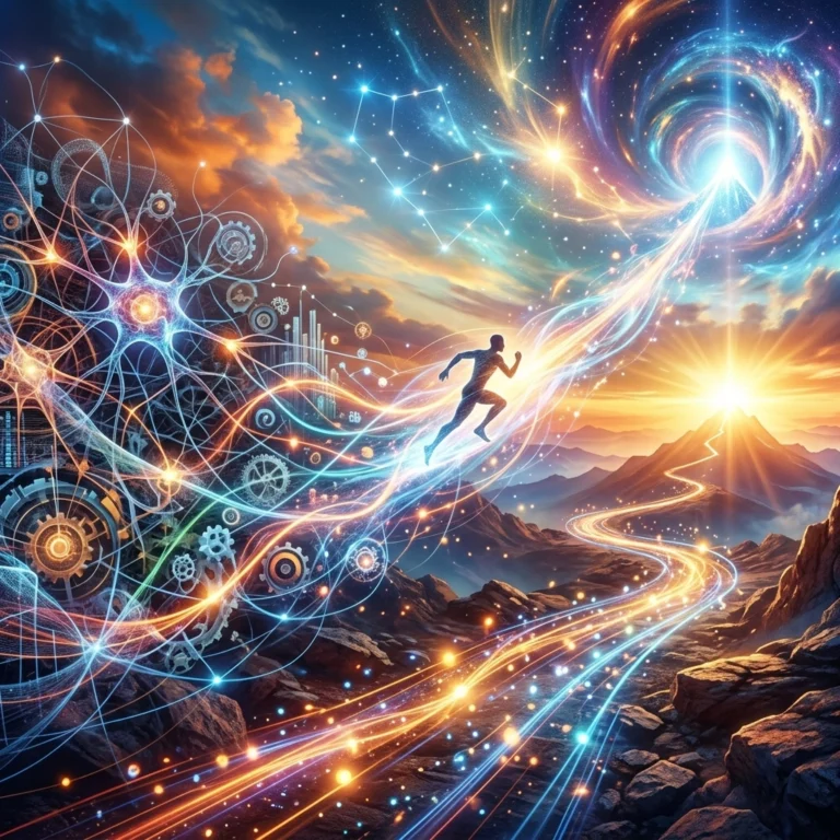 Visual: A translucent human silhouette filled with swirling, kaleidoscopic neon neural pathways that look like liquid electricity, representing the raw power of a regulated nervous system.