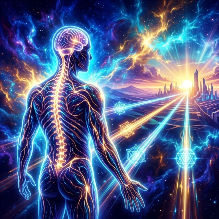 Visual: A shimmering, neon-colored fractal network representing the human nervous system, expanding out into a gold-dusted cosmic void.